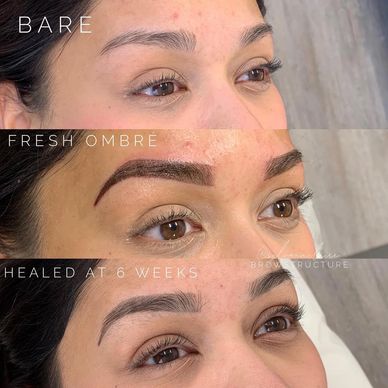 Using a tattoo machine, the skin is dusted with pigment. The brows start as a full solid color that heal to a powdery look, similar to makeup brow powder. Generally lasts longer than microblading, and is ideal for clients with oily skin, large pores, or have warmer skin temperatures.